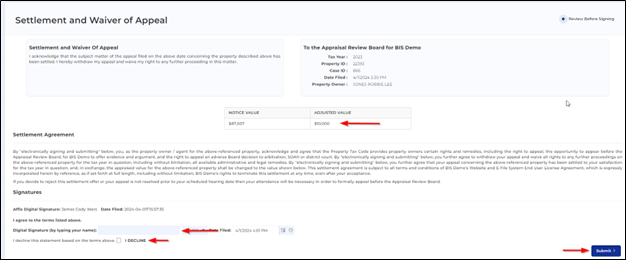 If you agree with the adjusted value, you will sign digitally by typing your name and clicking “Submit”. If you do not agree with the value and would like to reject the offer, click the box next to “I DECLINE” and click submit. The district will be notified of your response. Once you have submitted your response, you will not be able to change it.