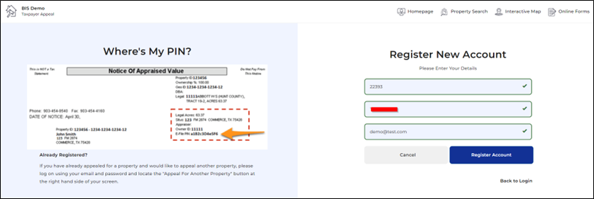 2. To register a new account, enter your property ID, E File PIN, and email address. If your entry matches the CAD records and the PID qualifies for E File, you will see green check marks in each field. Click “register account”. Enter your details and click “register account” again. You will be asked to log in.