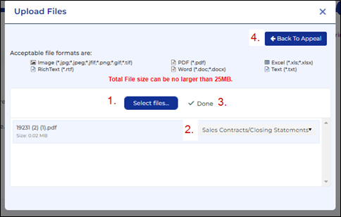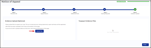 5. In step 5 you may upload your evidence. (this step is optional) Click “Select Files”, choose your files to upload and choose your evidence type. When the “Done” message appears, click “Back to Appeal”. You will be able to view the files you have uploaded. When you are finished, click “Finish”
