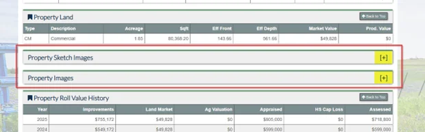 - For Harris Clients, new sections are now available to display property sketch images and property photos from PACS within the Property Search site. These sections are disabled by default for all clients and can be enabled through a back-end setting. If you would like to activate these features, please contact BIS Product Support.