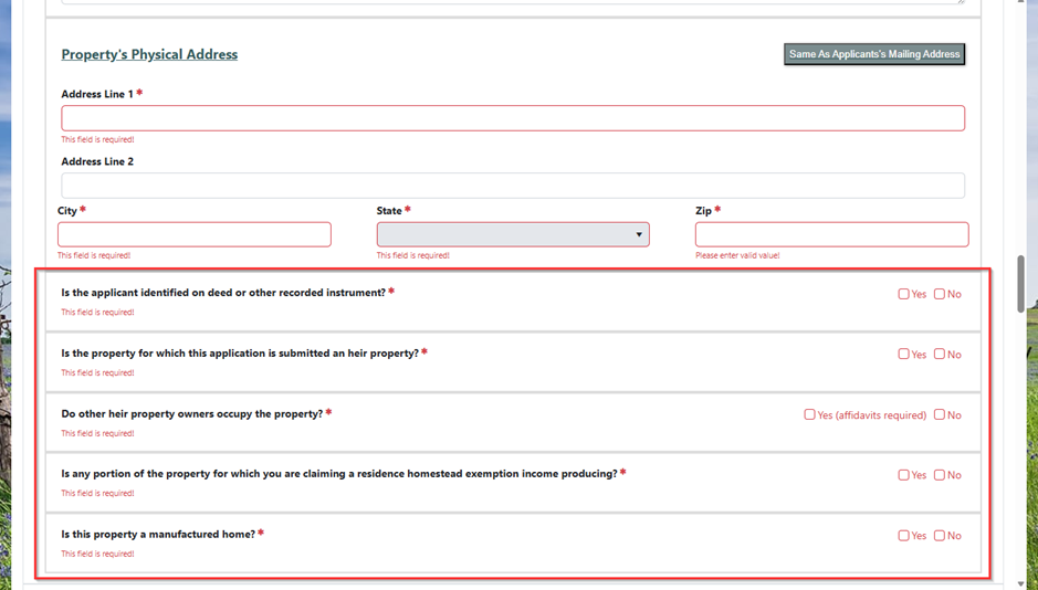 - The Online Forms Homestead Exemption application form has been updated so that more of the forms entry fields are required to be answered by the taxpayer. No new questions or fields were added as part of this update. This change helps ensure the form is completed more fully and accurately. The newly required fields are shown below.
