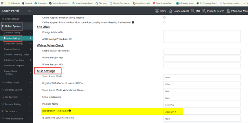 - This setting can be found in BIS Admin > Online Appeals > System Settings > Misc. Settings > Registration Field Name.