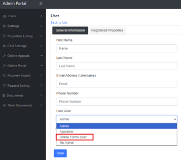 - The Bis Admin user role, Appraiser, has been updated. Users created with an Appraiser role will be able to log into Admin and access the Online Appeals dashboard and the Online Forms dashboard via the quick links in the site header. Appraiser users will not have access to the site settings menus.